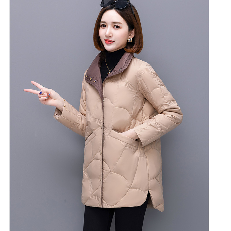 正規品の中長の薄いダウンジャケットの女性の立襟は斜めのポケットの白いアヒルの毛を開けて腰のコートの潮を収めて代行することができます。