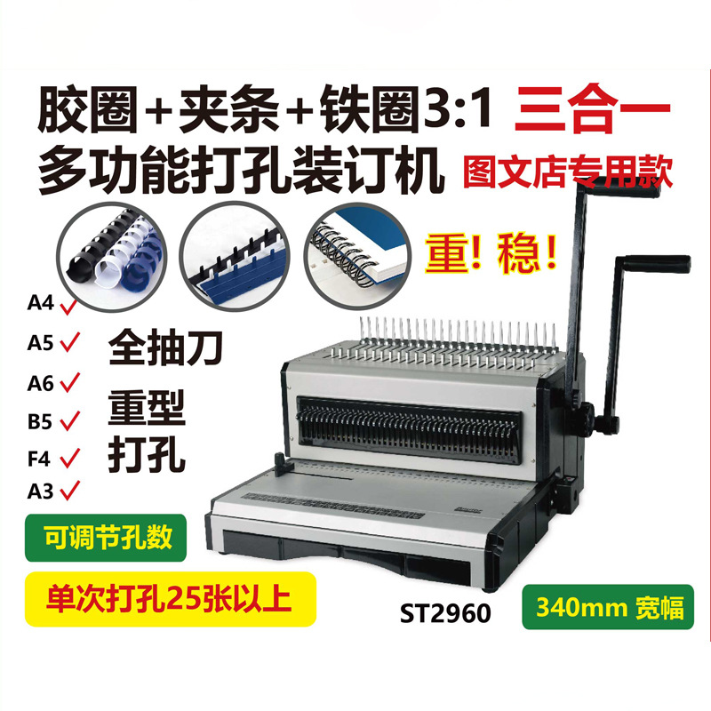 プラスチックリングクリップ鉄リング三合一打孔機一体機カレンダーテキスト打孔製本機ST2960