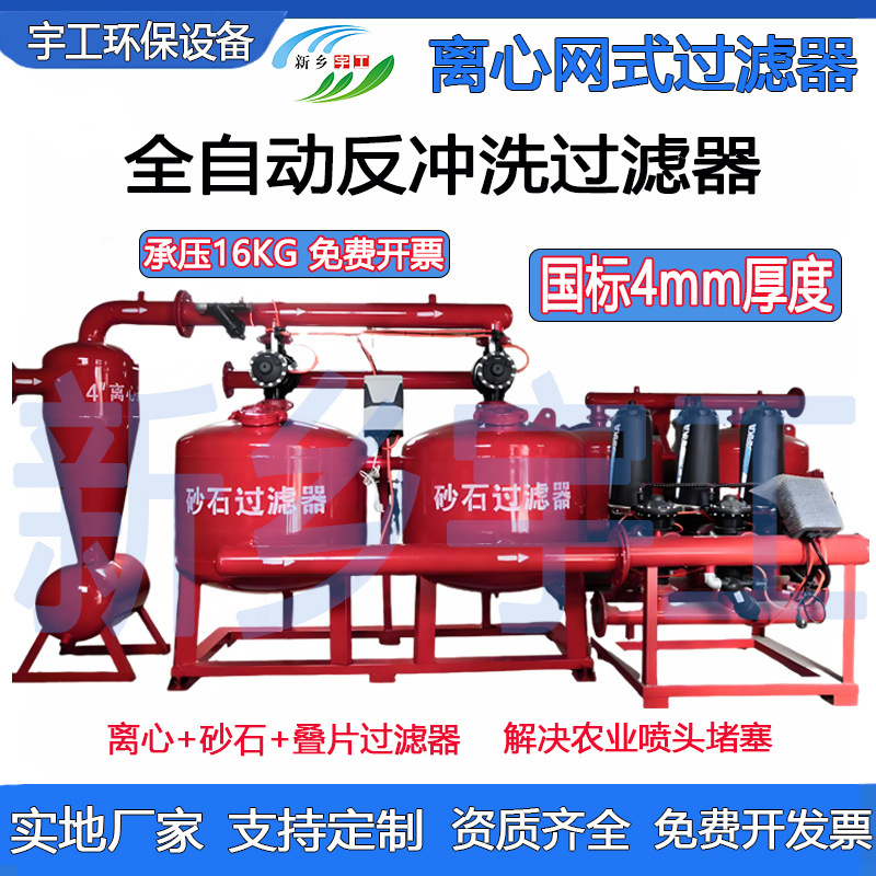 遠心メッシュフィルター、渦巻き泥除去装置、砂・砂利自動逆洗、沈砂施肥タンク、水と肥料の統合