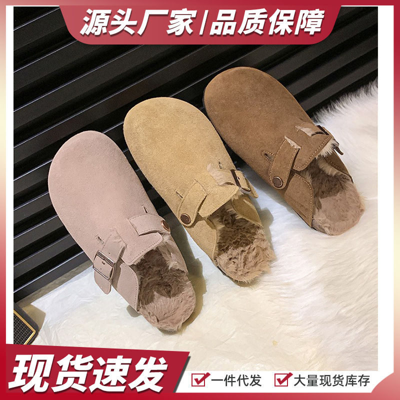 毛羽立ちの靴の厚い底の本革のベーケンの靴の2023秋冬の半分は外を引きずって足を踏んで包頭のネットの赤い服の同項のベルベットの女性を着ます。