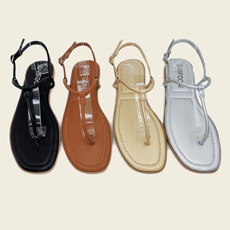 夏のサンダルの女性は新しいフラットサンダルを着ています。