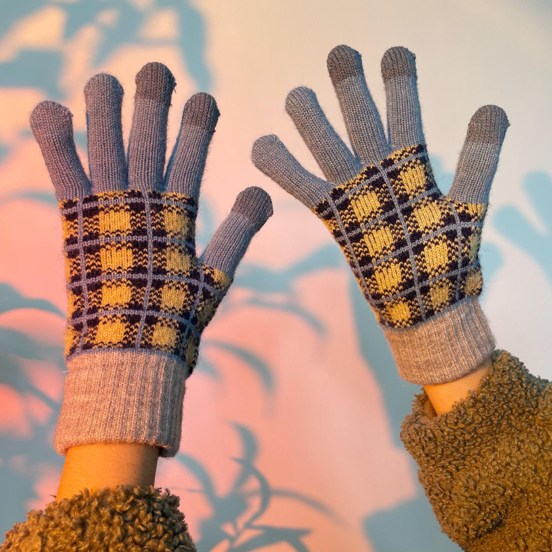 タッチパネルにベルベットをつけて格子手袋を厚くした冬の男女学生は、保温してかわいいカップルは手袋を指している