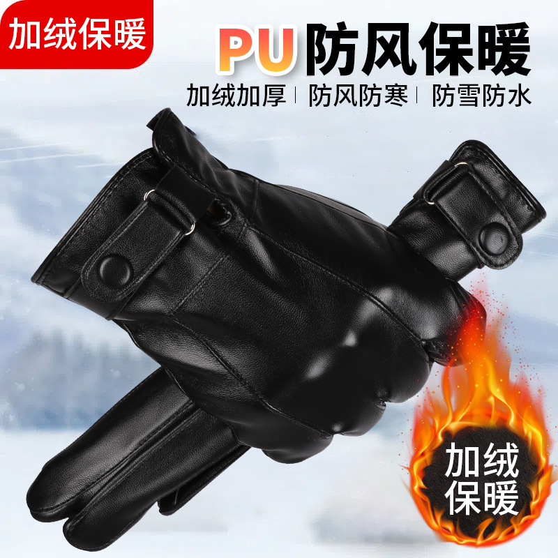PU手袋男性秋冬自転車にベルベットをつけて屋外の防風保温タッチパネルを厚くして模造手袋に乗る