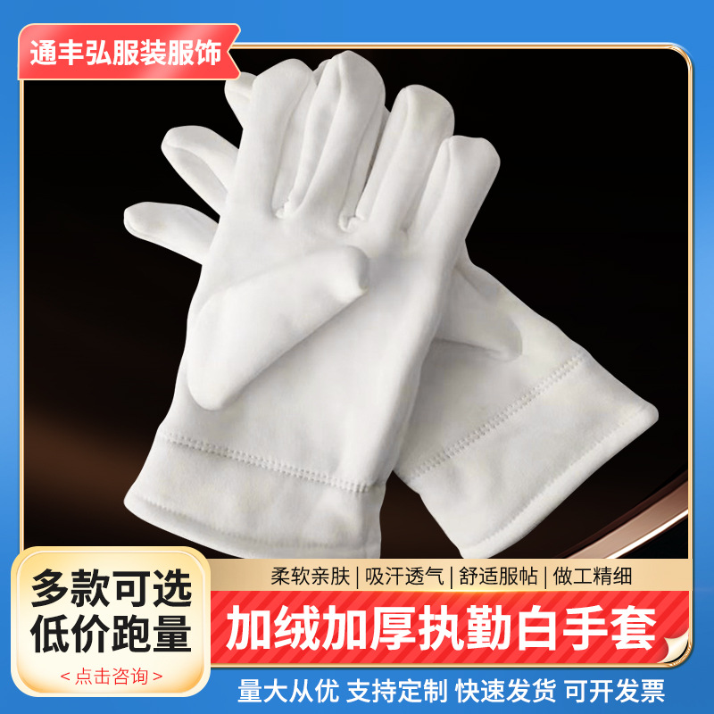冬の三筋とベルベットは白い手袋を厚くして交通勤務のマナーをチェックして、警備員が保温駅の手袋に乗る