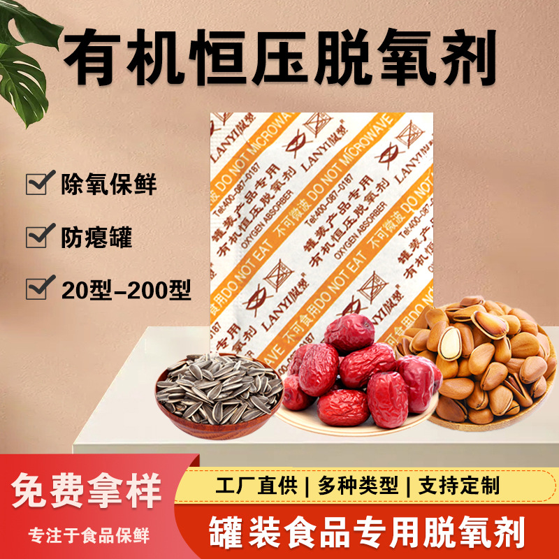 有機恒圧脱酸素剤は、食品、ナッツ、ドライフルーツ、焙煎食品の酸素除去と鮮度保持に使用され、缶が潰れることを防ぎます。
