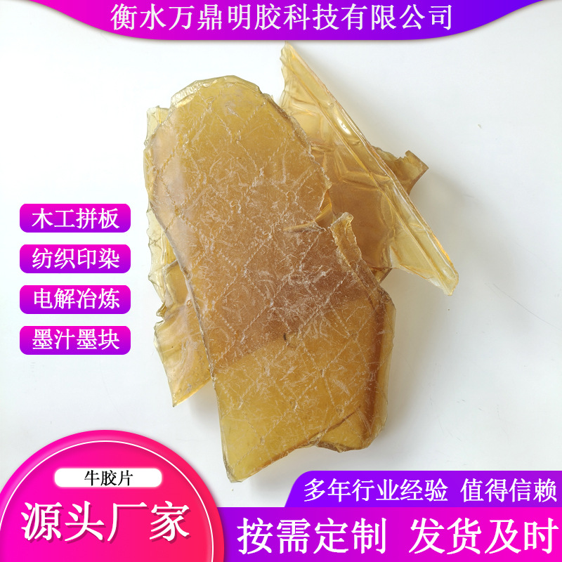 薄片状牛皮膠、冶金、織物染色、布地糊化、動物性牛皮膠片、木工接着、牛皮膠工業用牛皮膠片