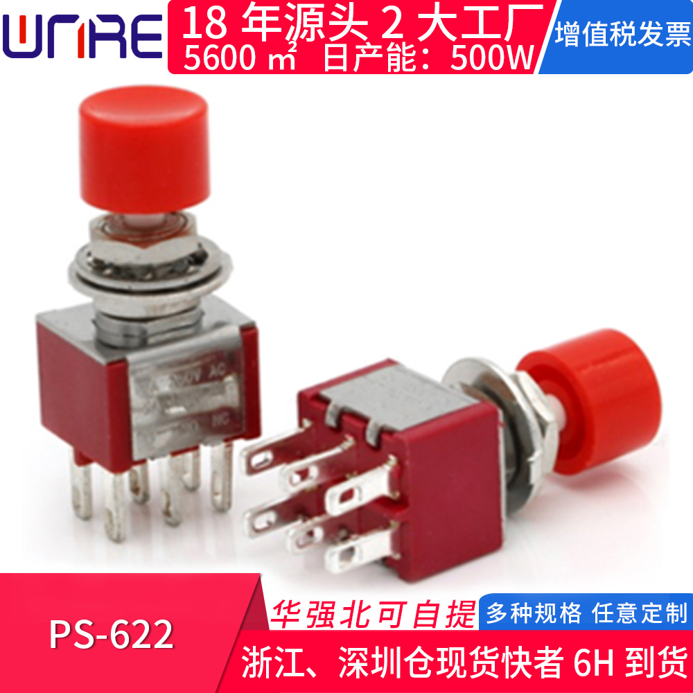 PS-622丸型点動ボタンスイッチロック無しセルフリセット有声六脚防水キャップレッド2A 250V
