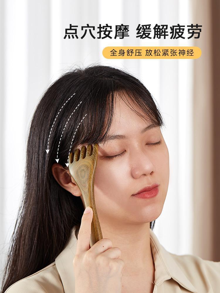 五爪頭部マッサージ櫛緑檀木櫛長腕頭皮経絡ブラシで頭をつかんで治療します。