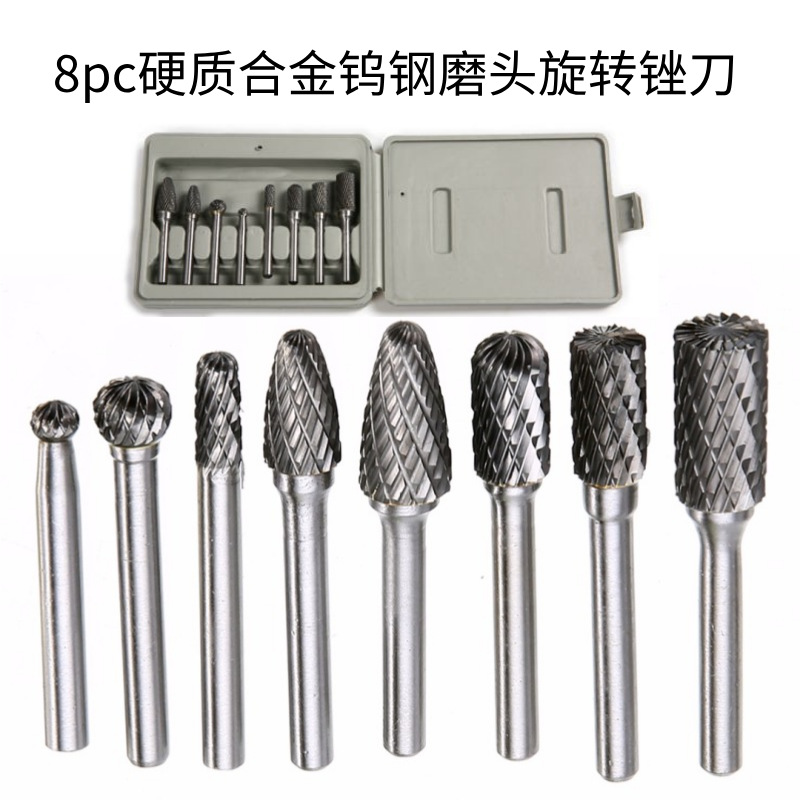 8pc超硬タングステン鋼研削ヘッド回転やすりドリル彫刻木彫り研磨フライス回転カッター
