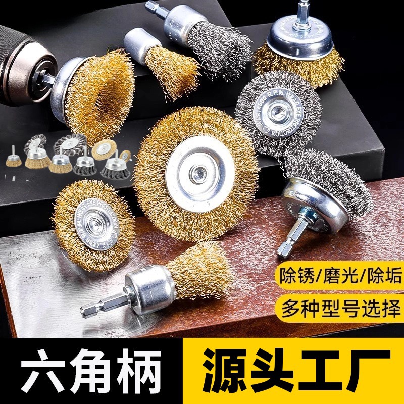 クロスボーダー6mmバー付きt形鋼ブラシ碗型平型ワイヤーホイールブラシ六角バー電気ドリル本色ワイヤーブラシ