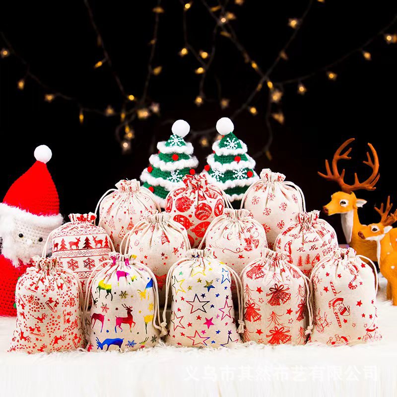 クリスマス箔押し綿麻巾着袋プリント入りギフトバッグジュエリーキャンディバッグクリスマス限定