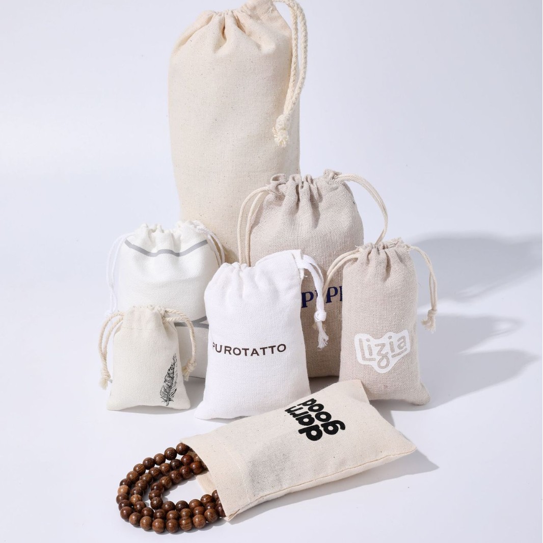 カスタムメイドの源工場製綿麻巾着袋、茶葉・食品包装用綿麻袋、シルク印刷ロゴ入り