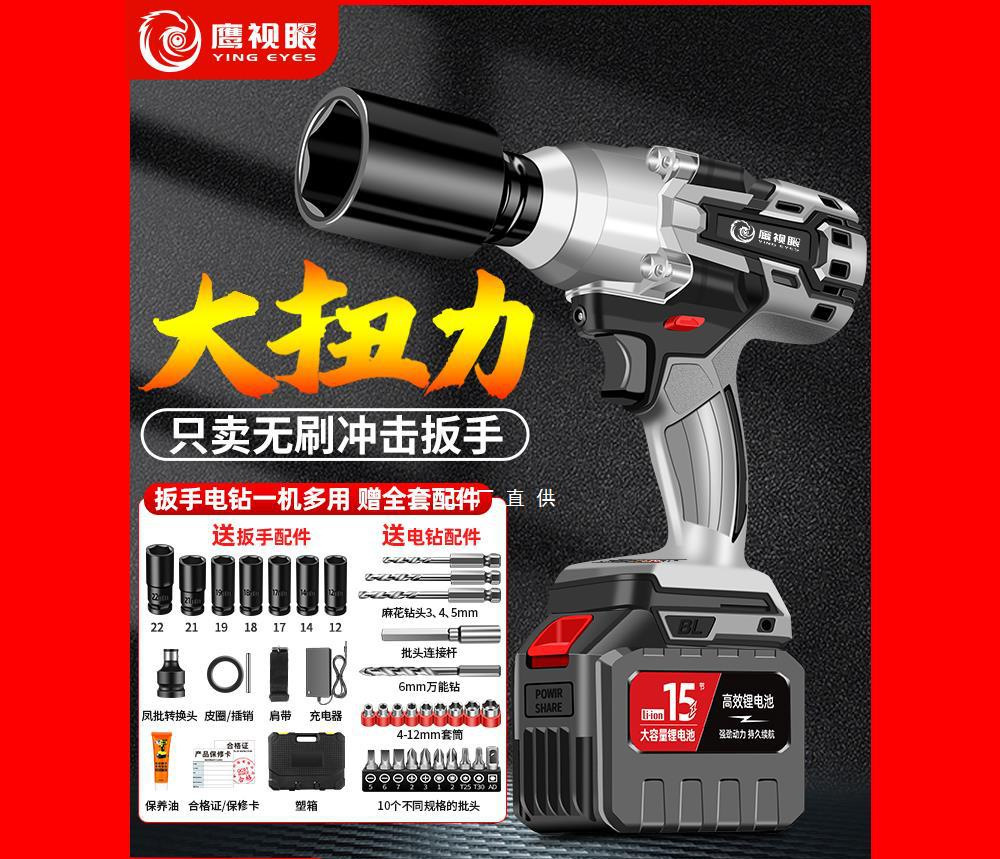 鷹視安ブラシレス電動レンチ大トルクリチウム電気充電レンチ衝撃自動車修理架子工スリーブ風砲