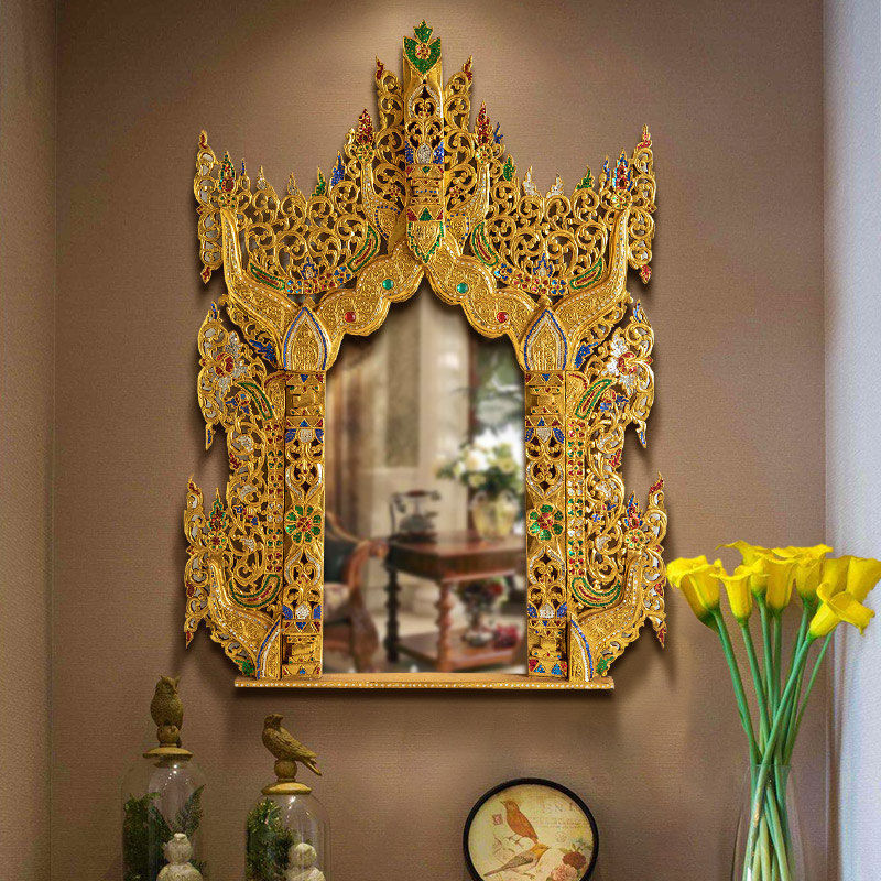 異麗タイ実木彫刻鏡枠玄関寝室壁飾り東南アジア化粧台化粧鏡トイレ掛け鏡
