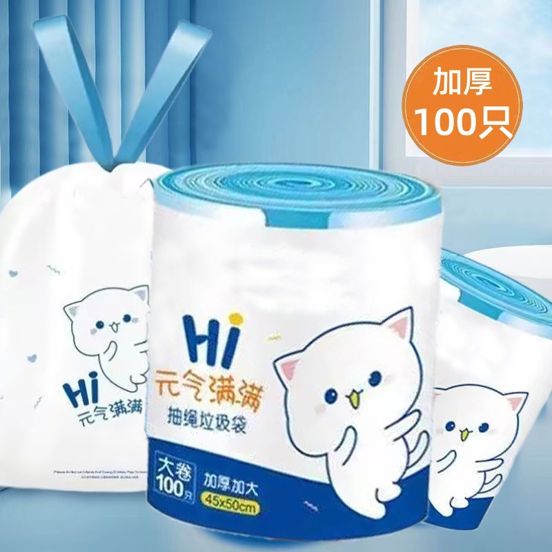 破れない巾着式ゴミ袋100枚入り、特大・極厚、家庭用、キッチン、トイレ用、プリント入り、卸売、在庫あり