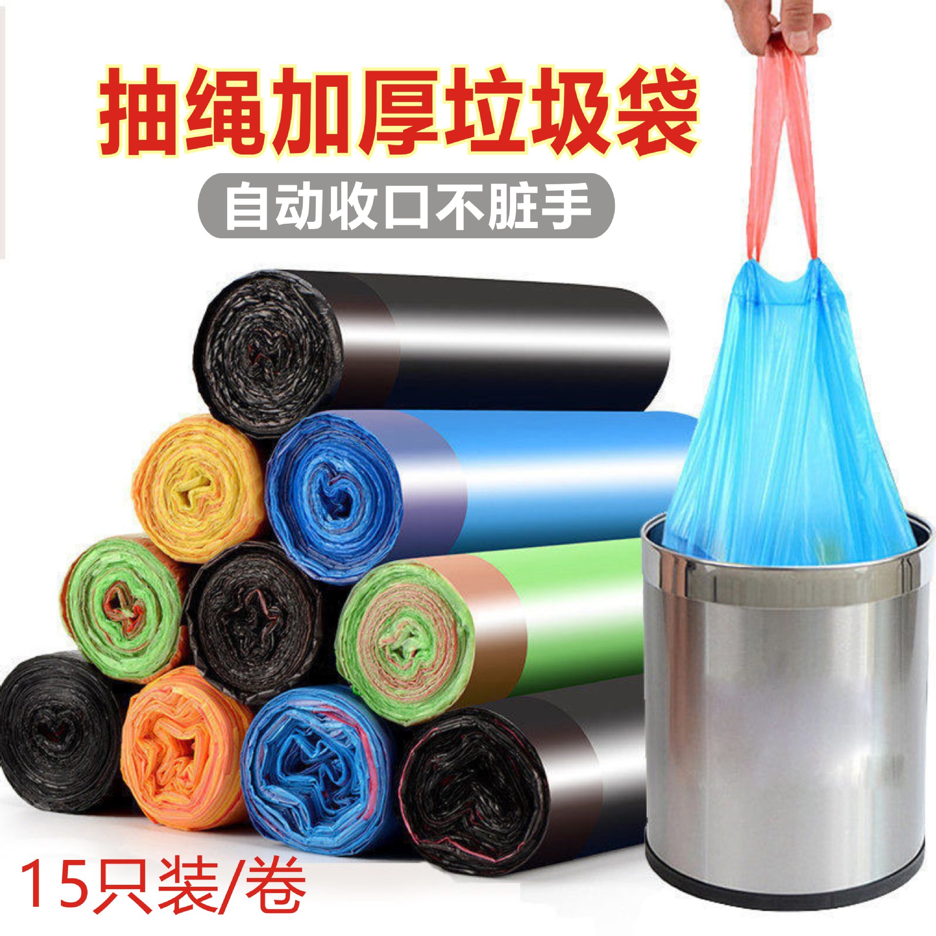 ひもを引くゴミ袋のカラー点断式手提げゴミ袋は自動的に口を閉じます。