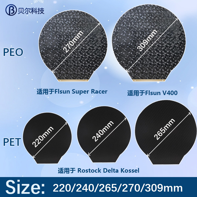両面プリントホットベッドスプリング鋼板円形peo/pet円形直径220/240/265/270/309mm