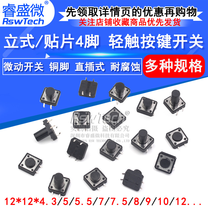 縦型4脚タッチボタンマイクロスイッチ12x12x4.3/5/6/7/8/9/10/11/12/16mmインライン