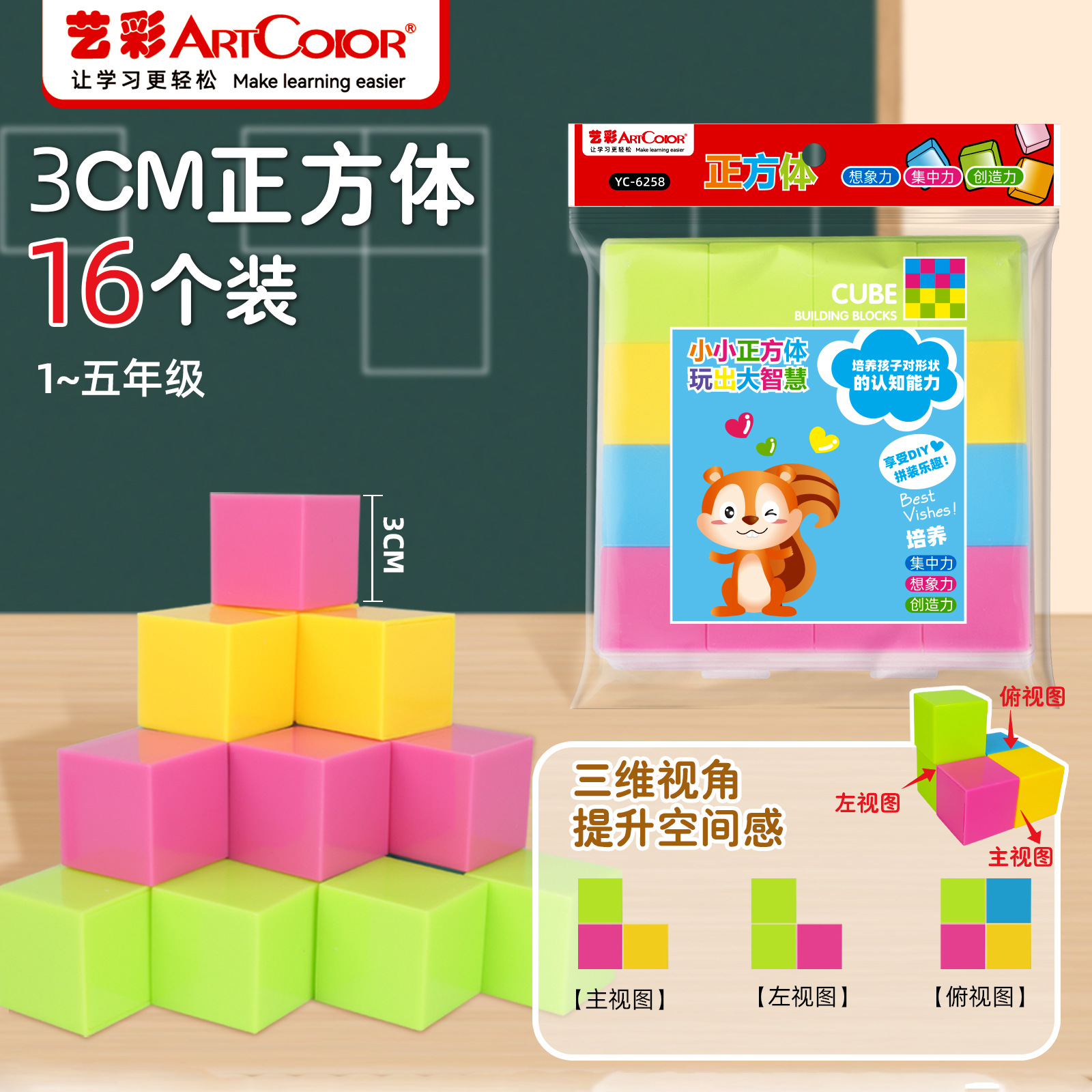 3cmの立方体の四角のプラスチックの積み木の空間の思惟の数学の卸売りの小学生の正方形の教具の幾何学