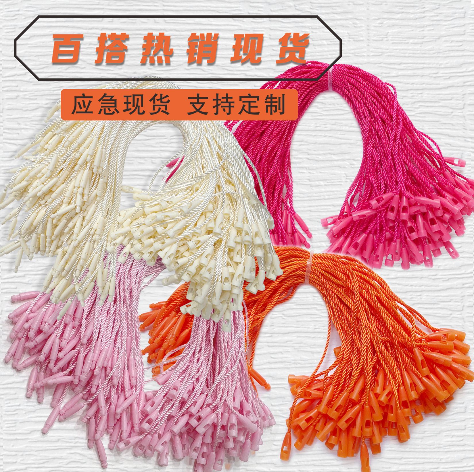 衣料品付属品、ピンと紐、衣料品吊り下げ紐、吊り下げタグ、手編み紐、衣料品タグ紐、タグ紐、衣料品用吊り下げ紐