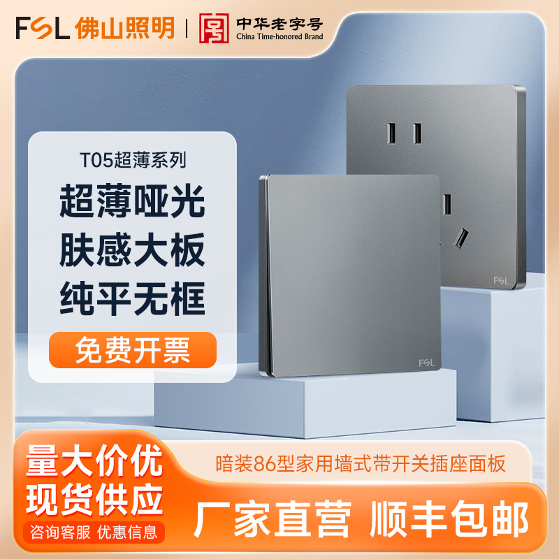 FSL佛山照明 T05 スターグレー 隠し設置型 2/3ピン 86型 家庭用壁掛け式 スイッチ付きコンセントパネル