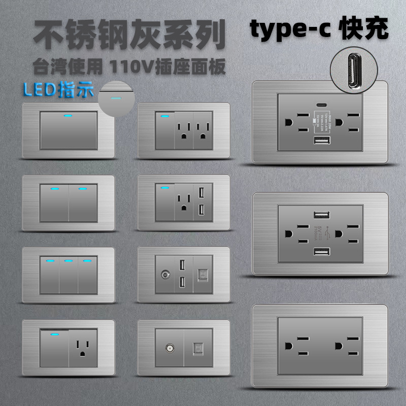 タイプ 118 アメリカ標準 15A ソケット USB ステンレス鋼グレー 110v ソケットパネル台湾アメリカ標準電源 6 穴