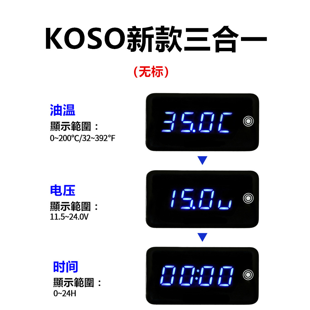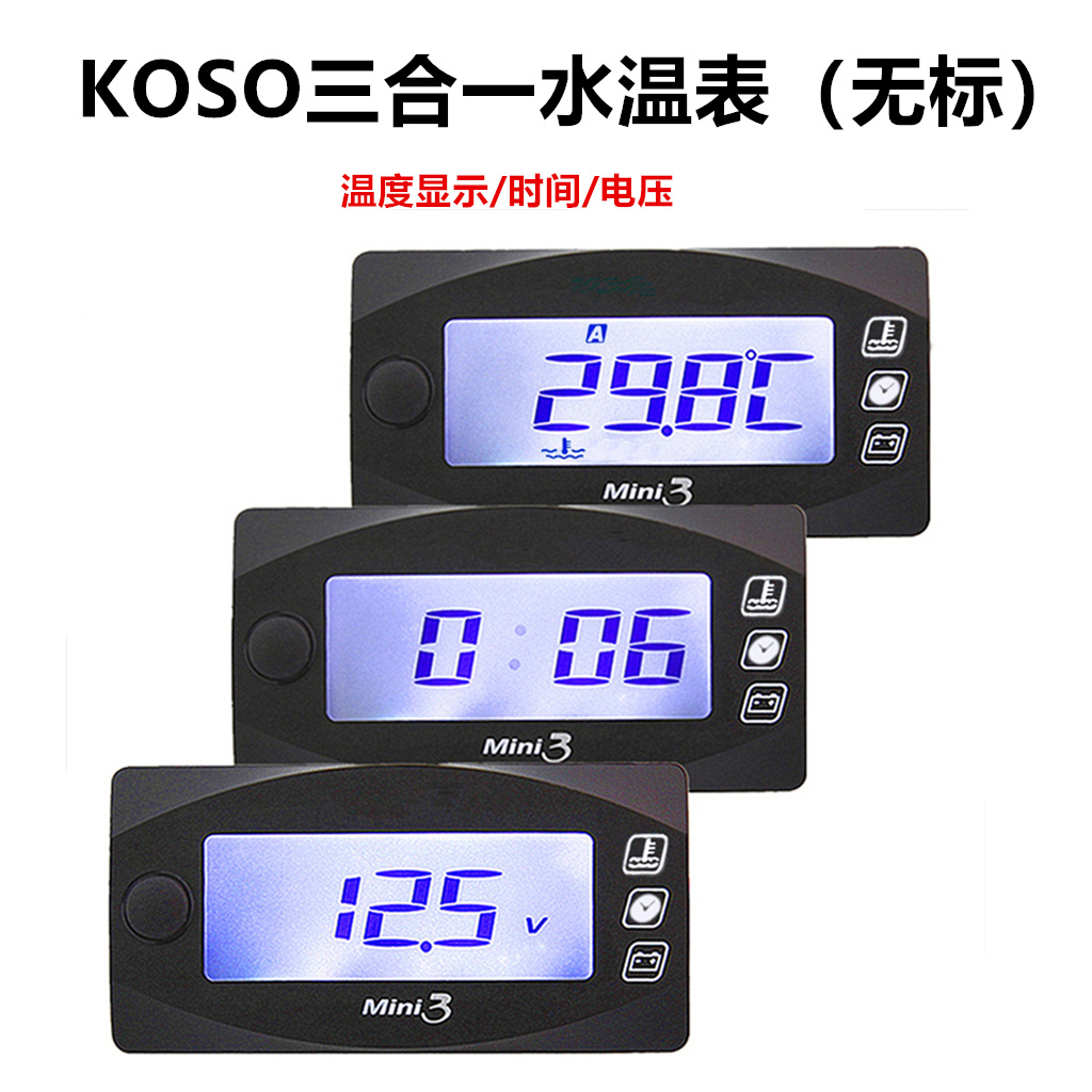 KOSO新型三合一オートバイ水温電圧時間液晶表示ミニ通用温度計無標