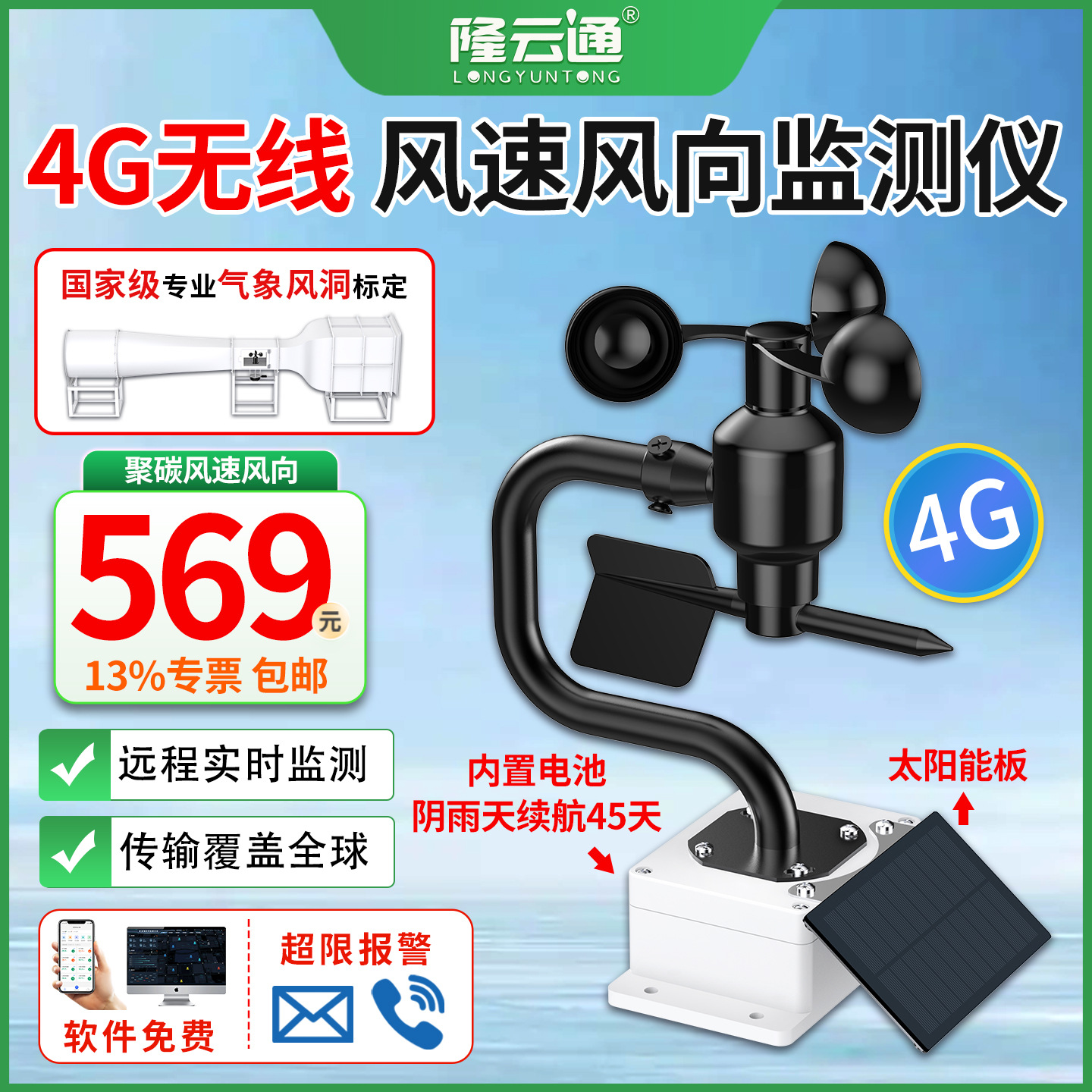 ワイヤレス4G風速計、遠隔リアルタイム監視、風速・風向測定器、高精度、山頂、屋上、タワークレーン、風洞用