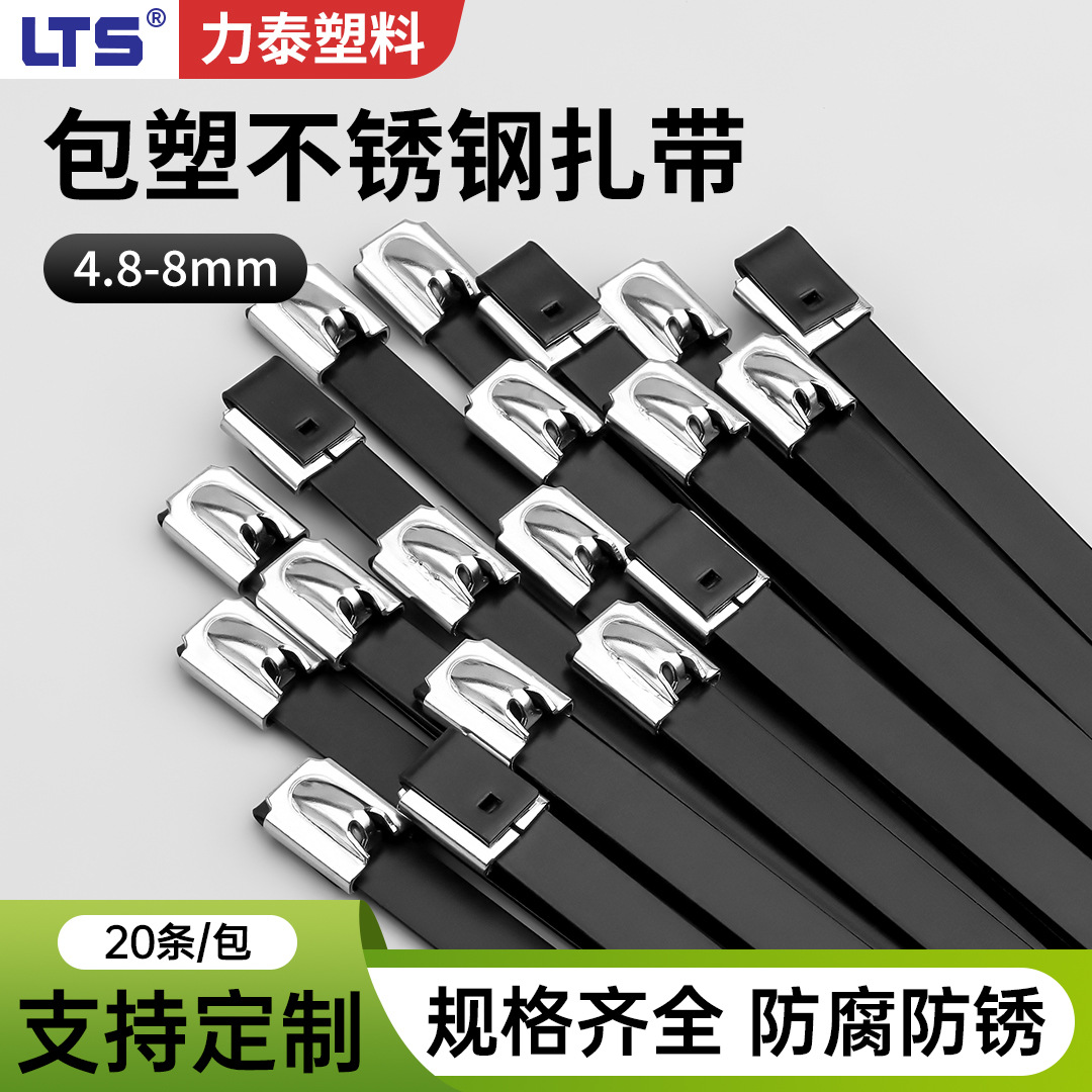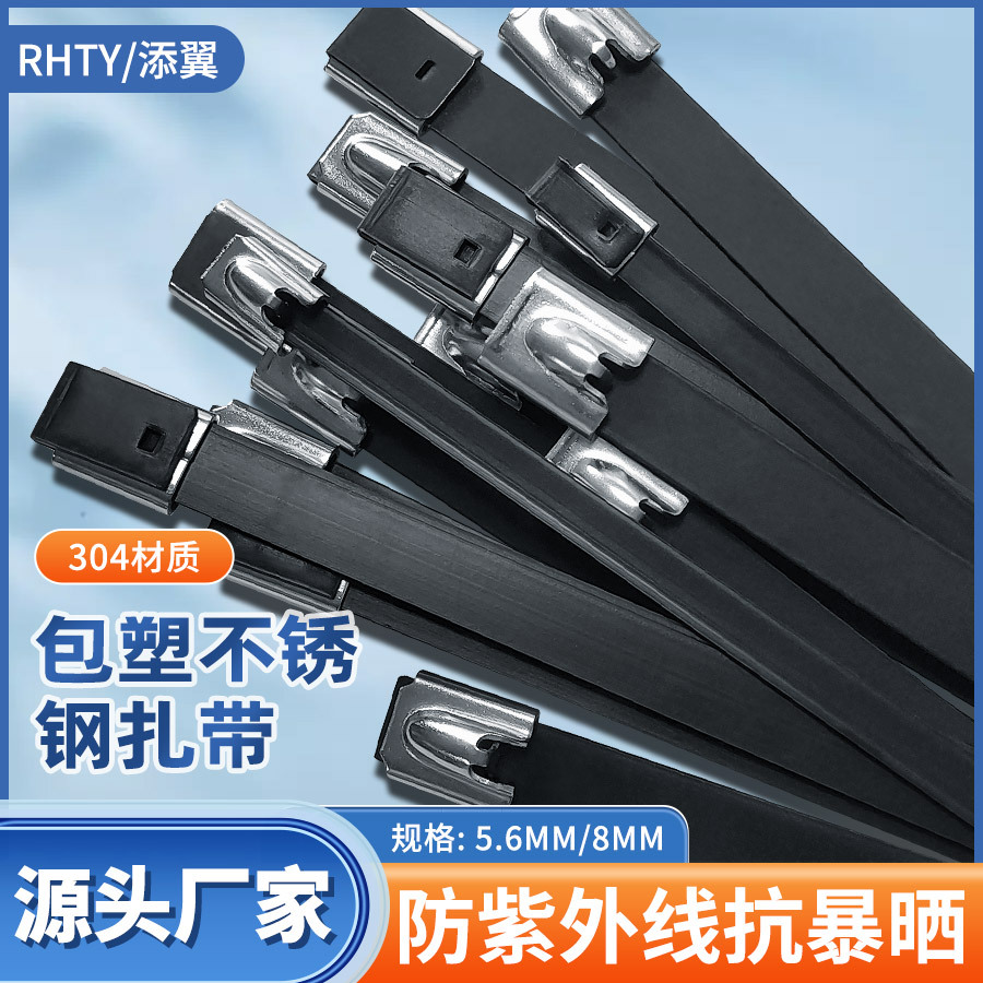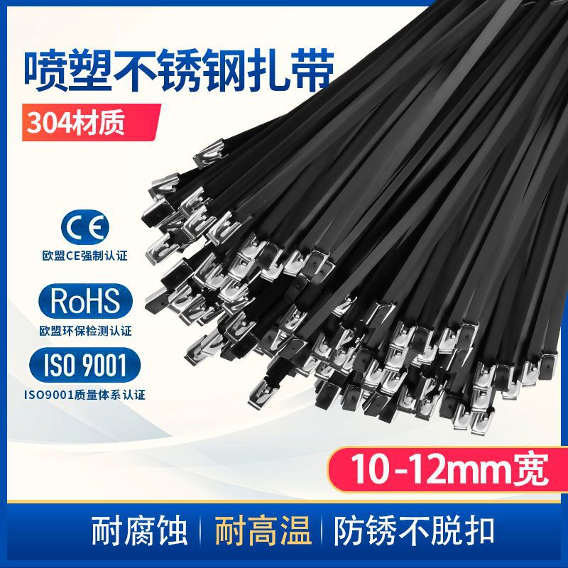 304 プラスチックコーティングされたステンレス鋼ケーブルタイ、セルフロックスチールバックル、マリンケーブルタイ、ブリッジクランプ、屋外高温耐性メタルブラック