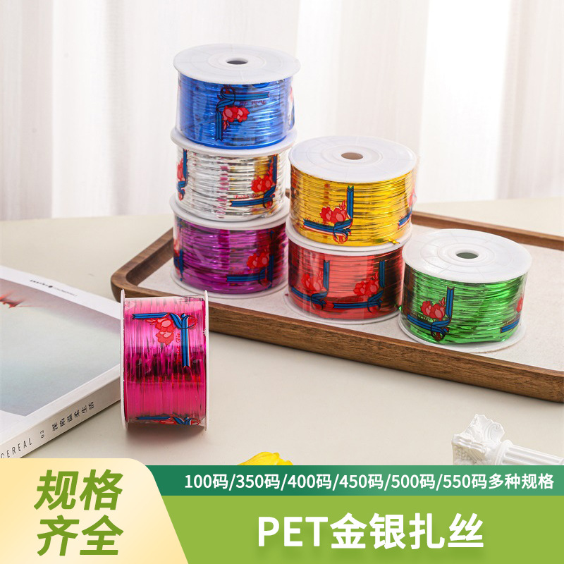 金銀パンのロリポップの糸でゴムを包みます。カラーの糸で500ヤードのpet金属のバンドを結びます。