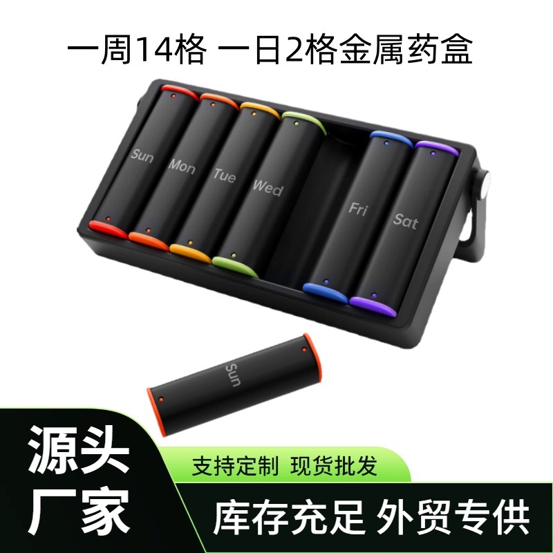Amazonの人気の金属製ピルボックス、1週間7コンパートメントの便利なピルボックス、食品グレードの密封された防水アルミニウム合金収納ボックス