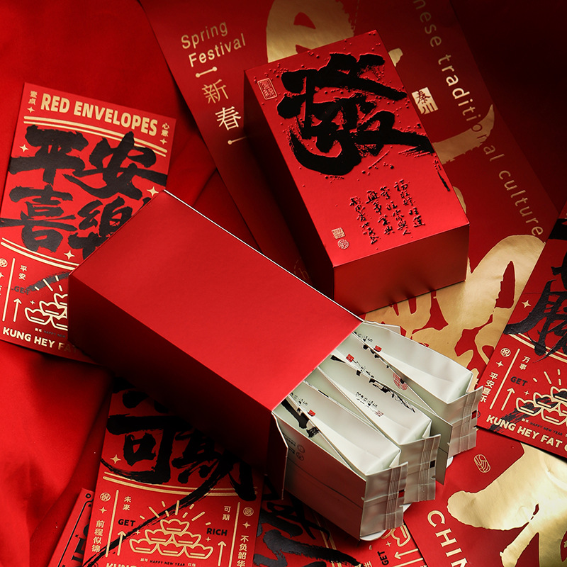 茶のギフトボックスのオーダーメイドのロゴの天地のふたを開けてプレゼントの箱を開けます。