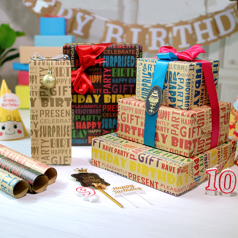 黄色の牛革の原色の全色は金の海洋の青い洋の赤と黒の底のフルカラーのアルファベットの誕生日の贈り物の包装紙を印刷します。
