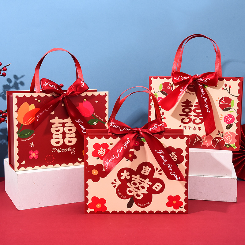 新しいウェディングハンドバッグ型ギフトボックス、赤い結婚式のギフトバッグ、お返しギフトボックス、記念品バッグ、ウェディングキャンディボックス、卸売