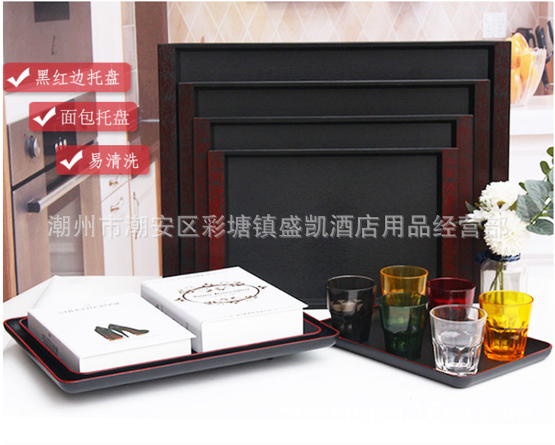 黒赤日本式木目ファストフード長方形レストラン料理ホテルの料理トレイ商用プラスチックトレイ