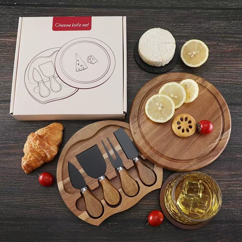 クロスボーダー木製チーズナイフセット4点セット家庭用キッチン木製ナイフとフォークセット円形竹木チーズボックス