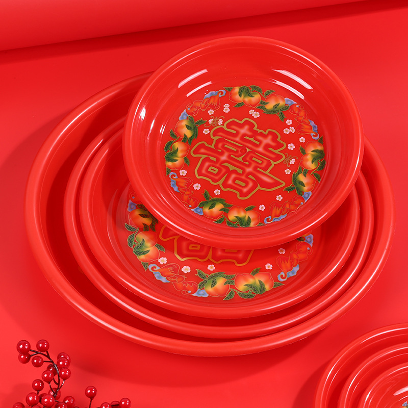 プラスチックの赤いトレーの結婚祝いの結婚祝いのお茶の皿は赤い皿の果物の供え物の皿を祭ります。