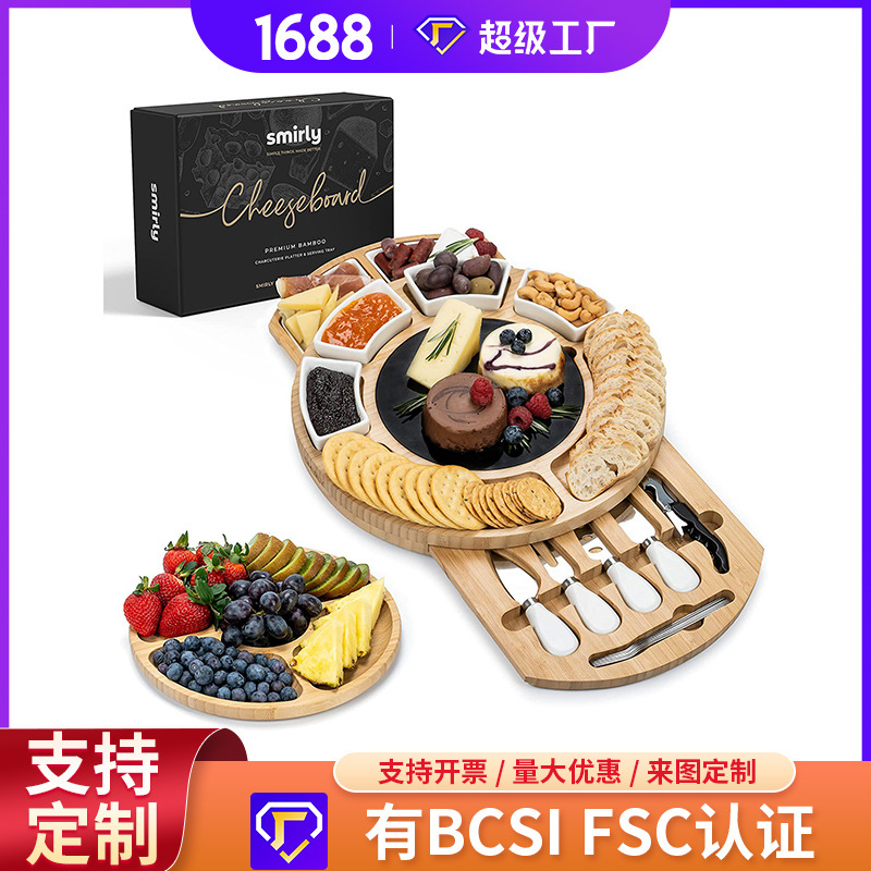 竹製まな板 キッチン用 丸型 引き出し式 チーズまな板 竹製チーズボード 包丁4点セット 工場卸売