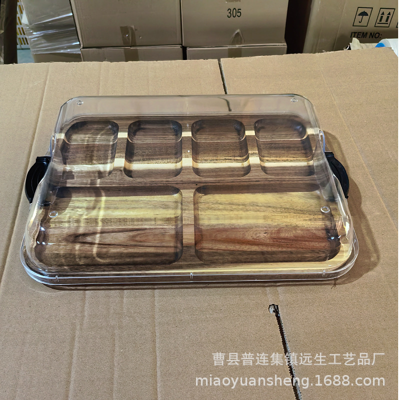 アクリル透明カバー付きクロスボーダー木製フルーツスナックトレイ、分割フォーマットホームパーティーペストリー分割トレイ