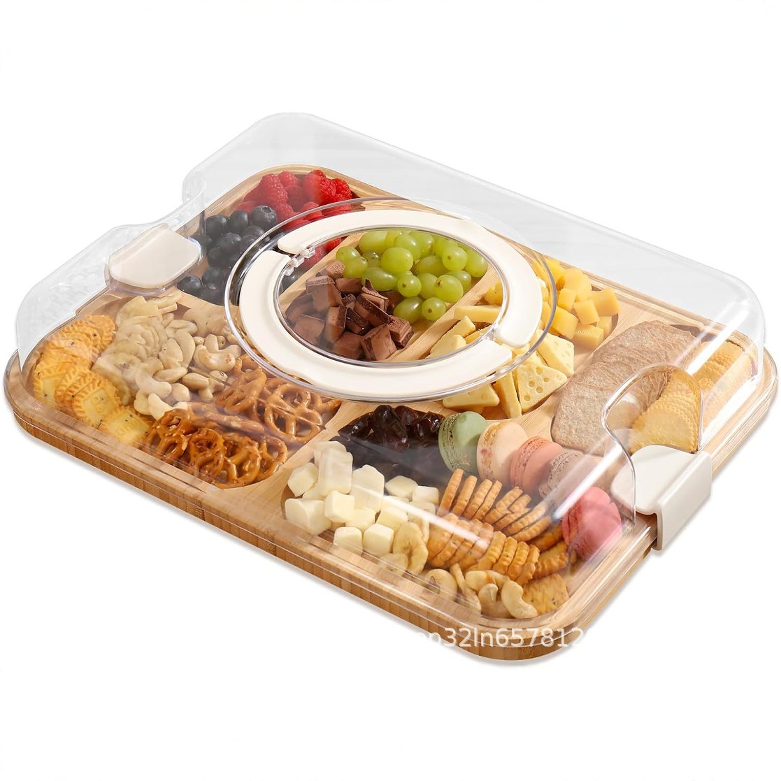 竹の木の熟食のトレーの円形の竹のまな板の透明な蓋の果物のトレーの多格の木製の熟食の装飾の皿の木のトレー