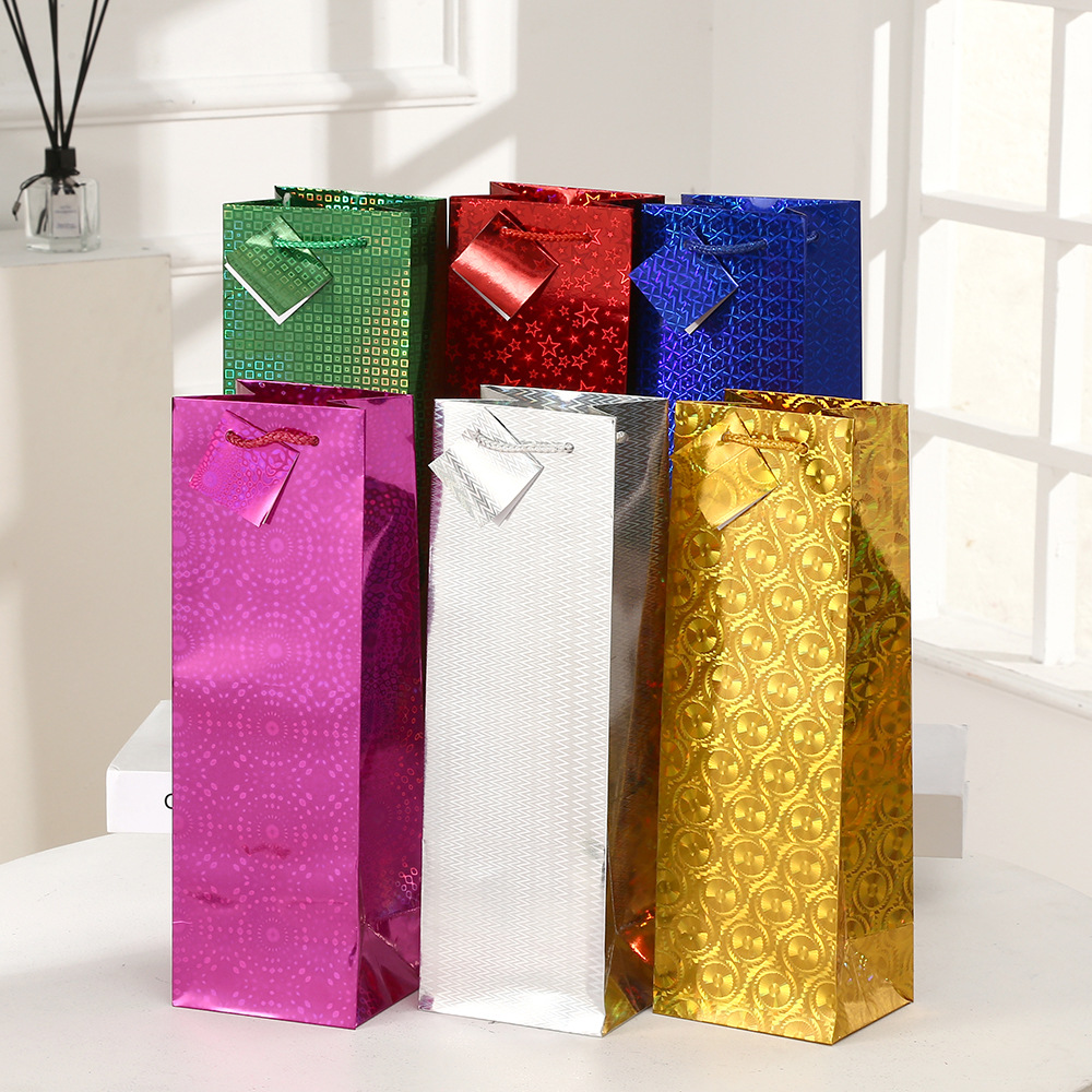 新商品の厚いワインの紙袋のレーザーフィルムのワインの手提げ袋は金の美しい贈り物の包装袋の現物の卸売りにアイロンをかけます。