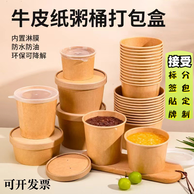 使い捨てのクラフト紙の碗のクラフト紙の包装の箱の丸いスープの碗のかゆの桶は蓋を持って厚い商用のテイクアウトの弁当箱を持ちます。