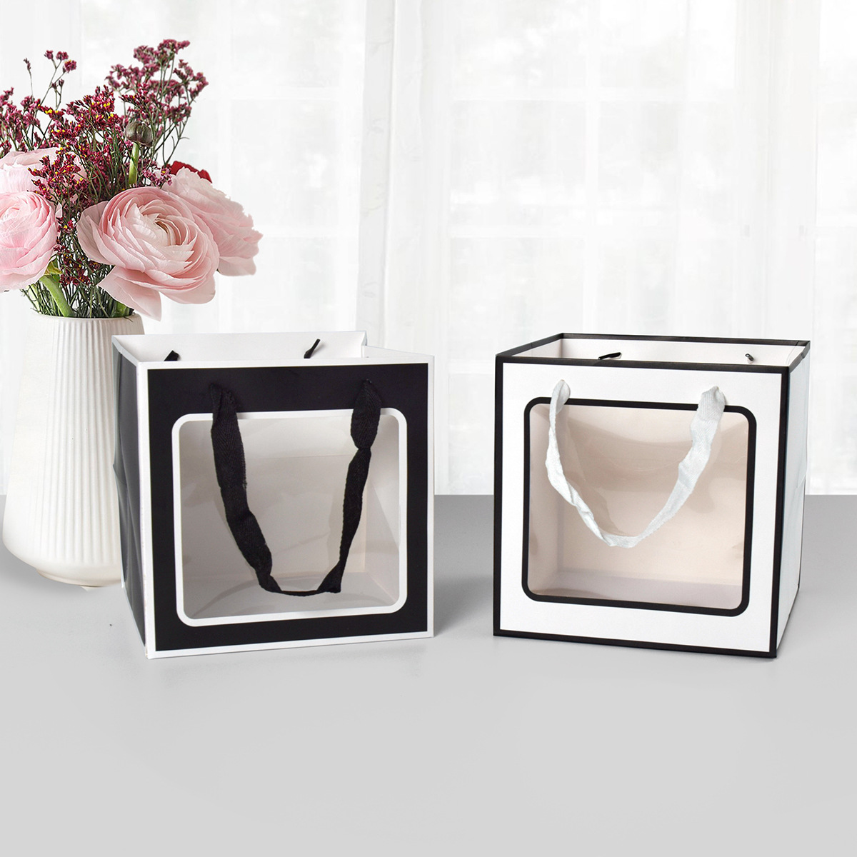 シンプルな正方形の透明な可視ウィンドウ大容量ギフトバッグ現物白黒花ケーキ手提げプレゼント紙袋