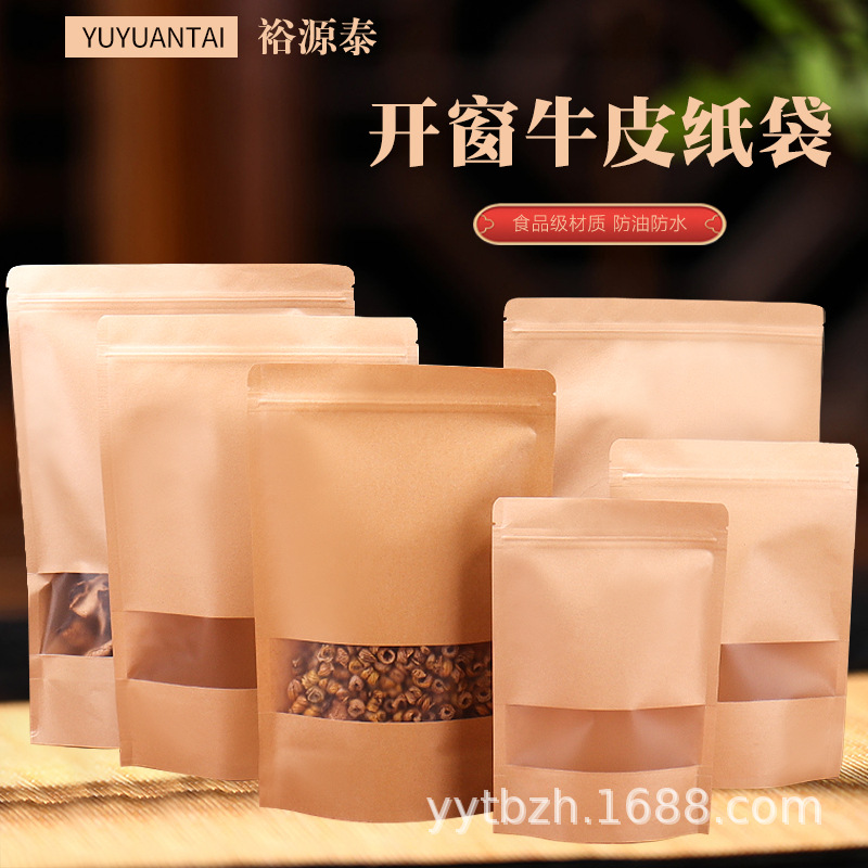新しいスタイルの窓付きつや消しクラフト紙袋、厚みのあるキャンディー、砂糖漬け、乾物、栄養価の高い薬用植物、一般的な包装ギフトバッグ