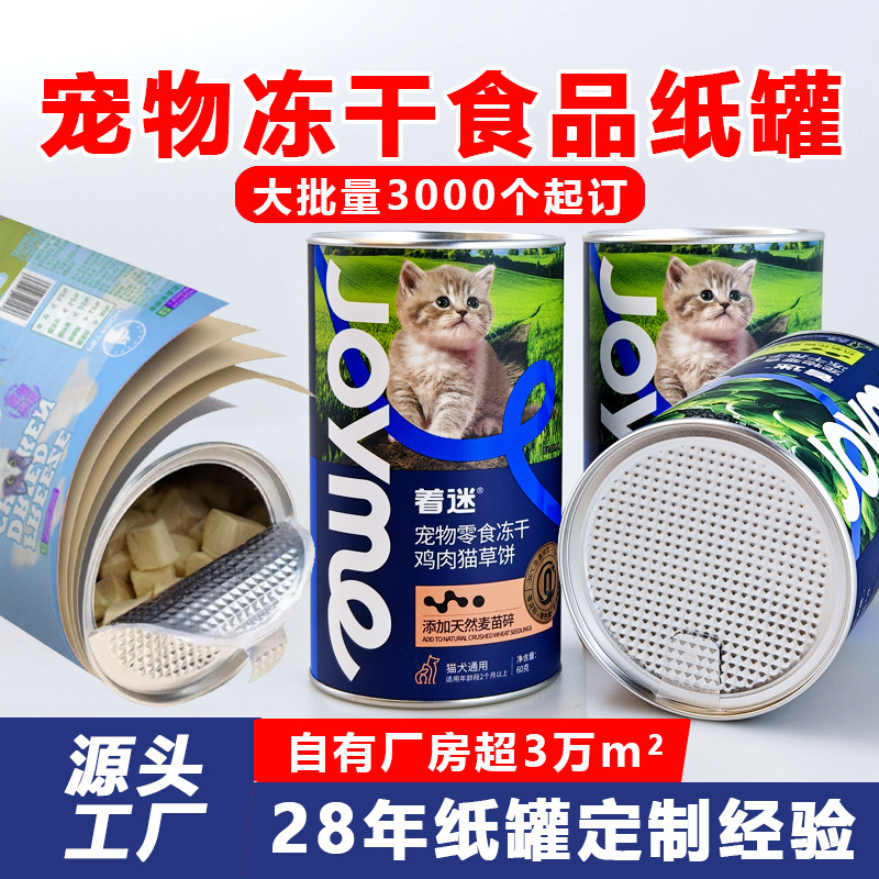 食品紙缶カスタム包装ペットアルミ箔破れやすいキャットフードドッグフードフリーズドライスナック紙管密封複合缶