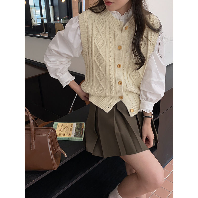 3th Morningフレンチスタイルの中古風ボタン麻の花の木目はニットのベストのカーディガンを重ねて着ます。
