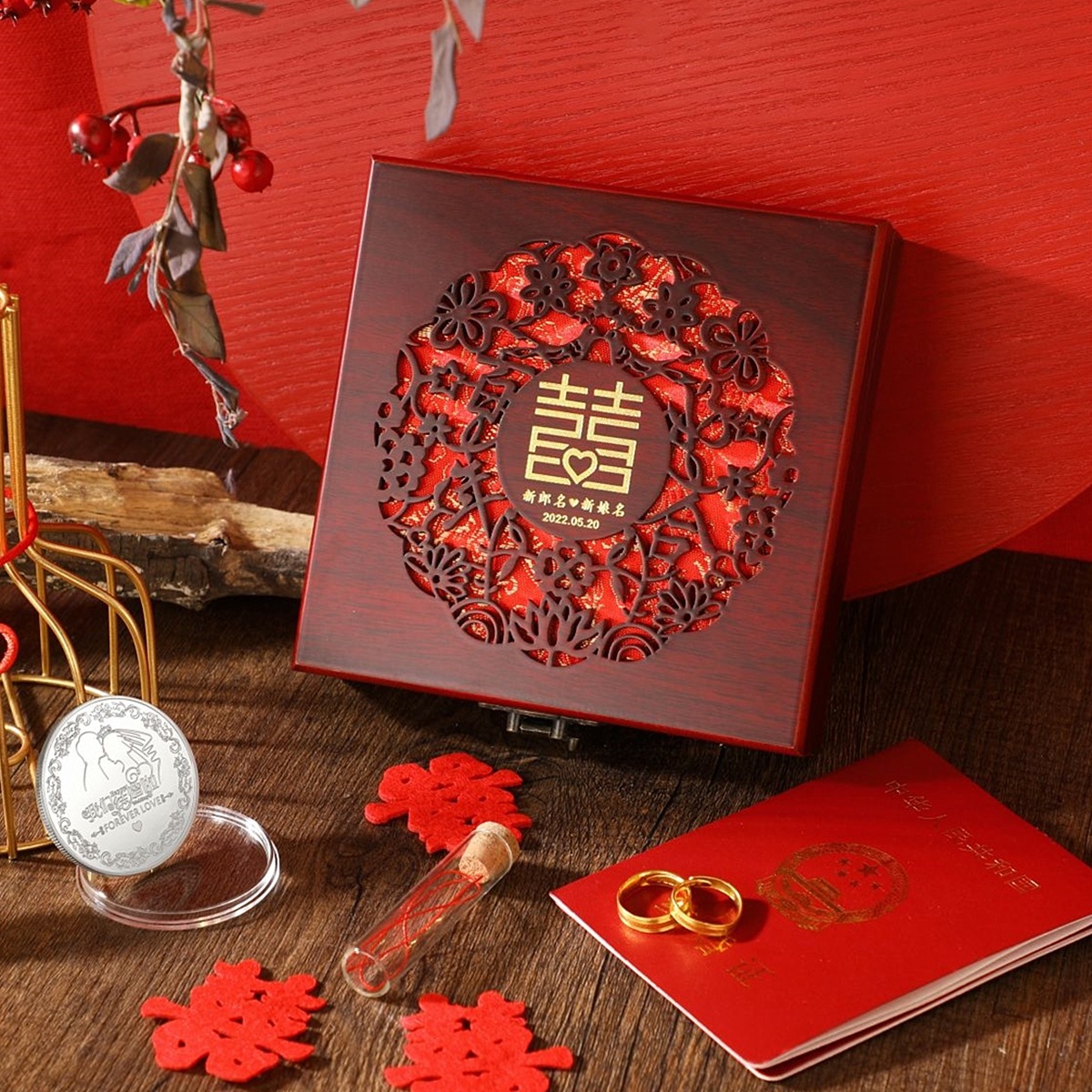 結婚証明書木箱、記念コインコレクションギフトボックス、木製ロック付きウェディングギフト、彫刻入りクリエイティブ収納ギフトボックス