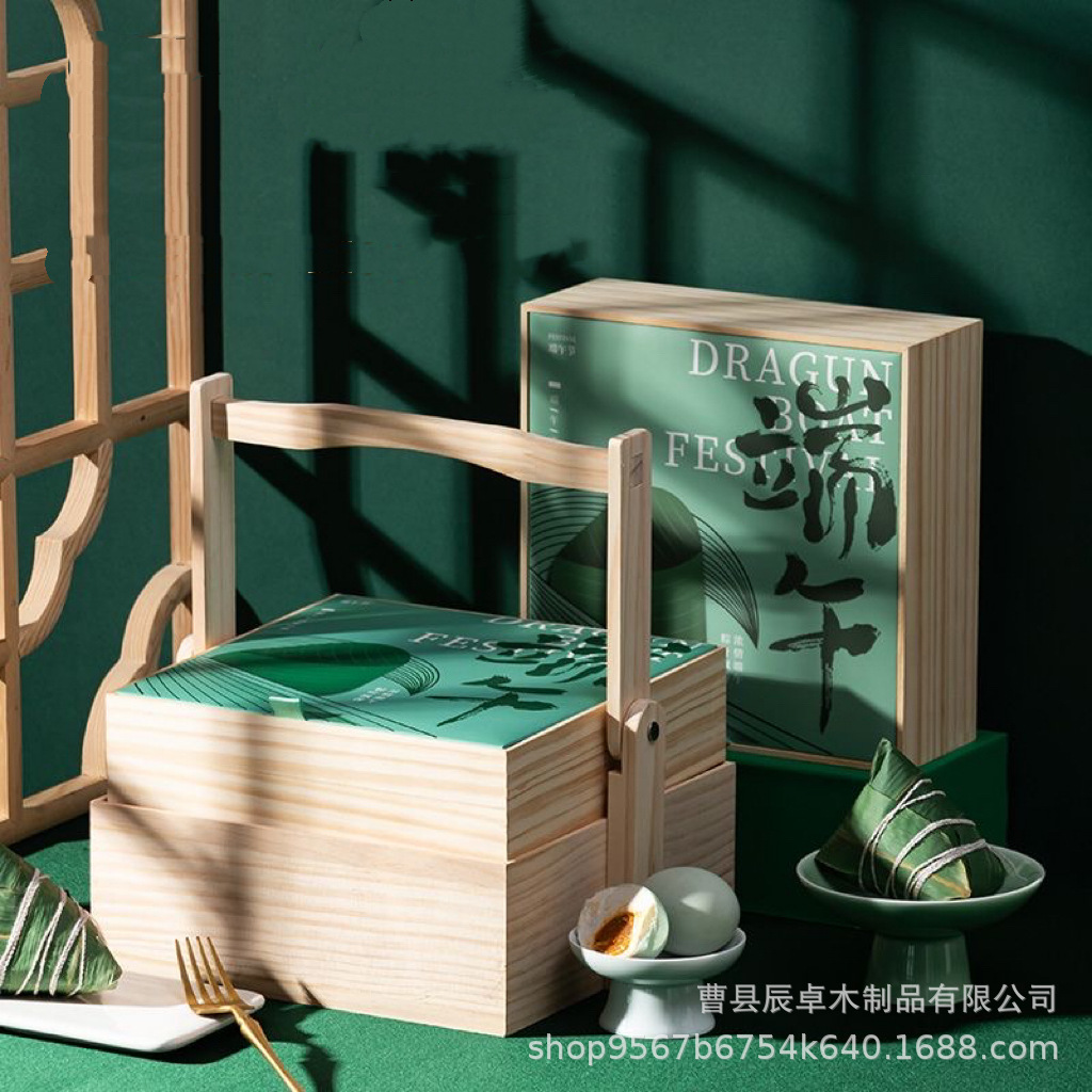 新しい木の端午の節句の贈り物の箱の二重のお菓子のお茶の包装の箱は手を携えて手の礼箱の実木のちまきの箱を持ちます。
