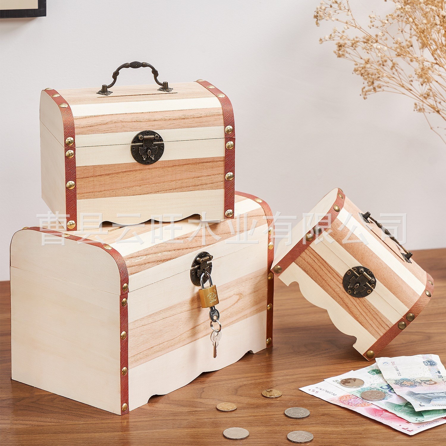 無垢材の子供用貯金箱、マルチ仕様のフリップトップロック付き木製収納ボックス、家庭用雑貨貯蓄および収納木箱