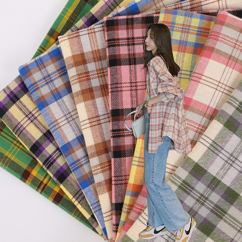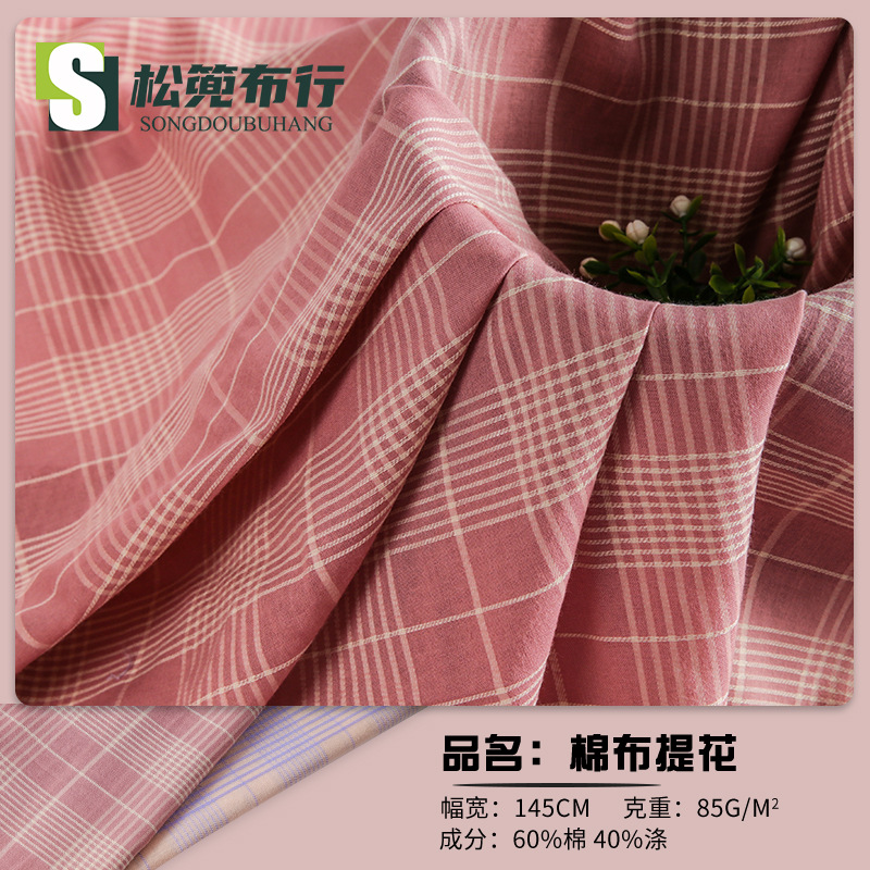 ポリエステル綿混紡色織ジャカード生地ポリエステル綿砂洗格子布工場ファッション婦人服子供服生地卸売り